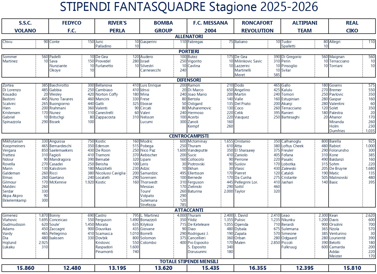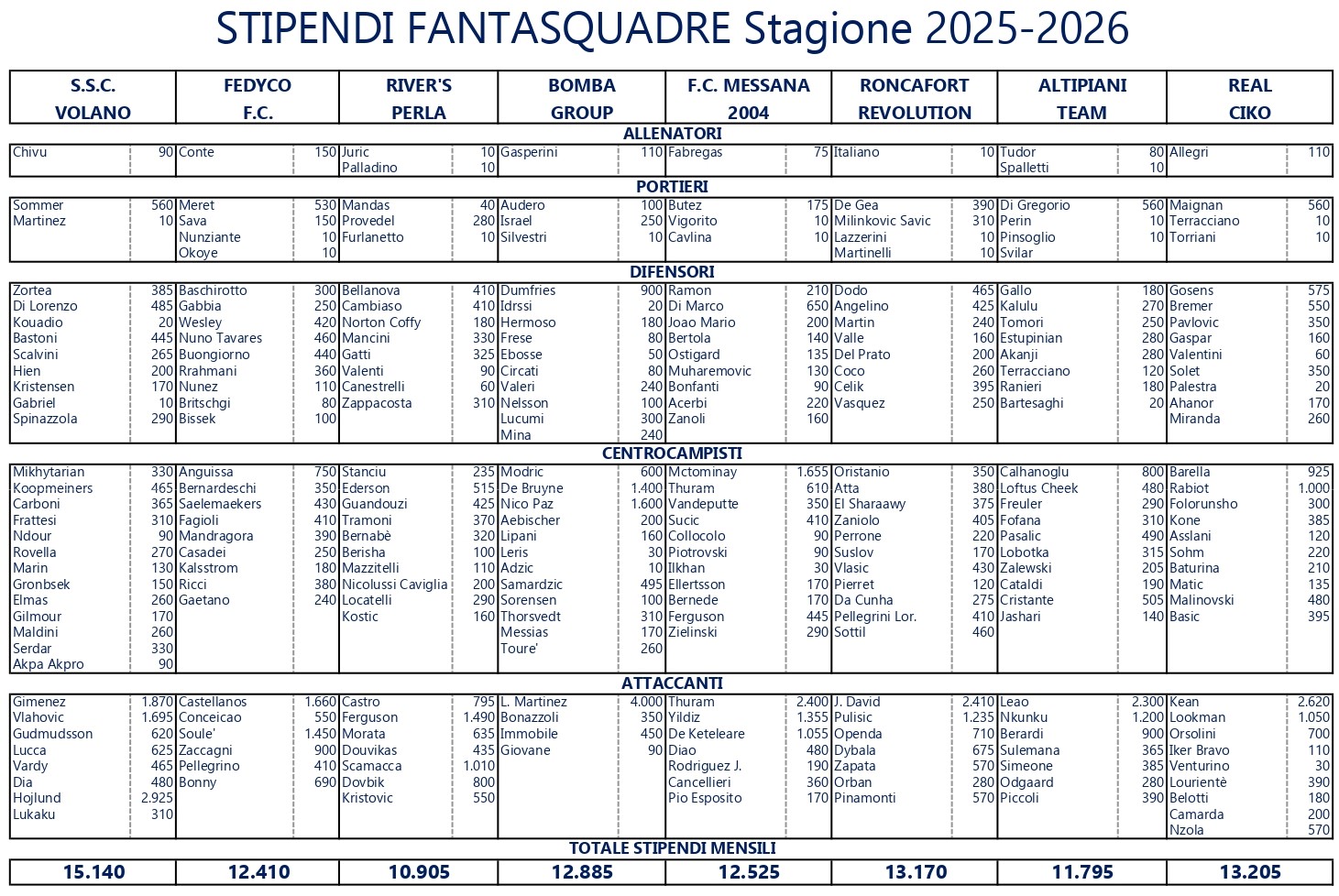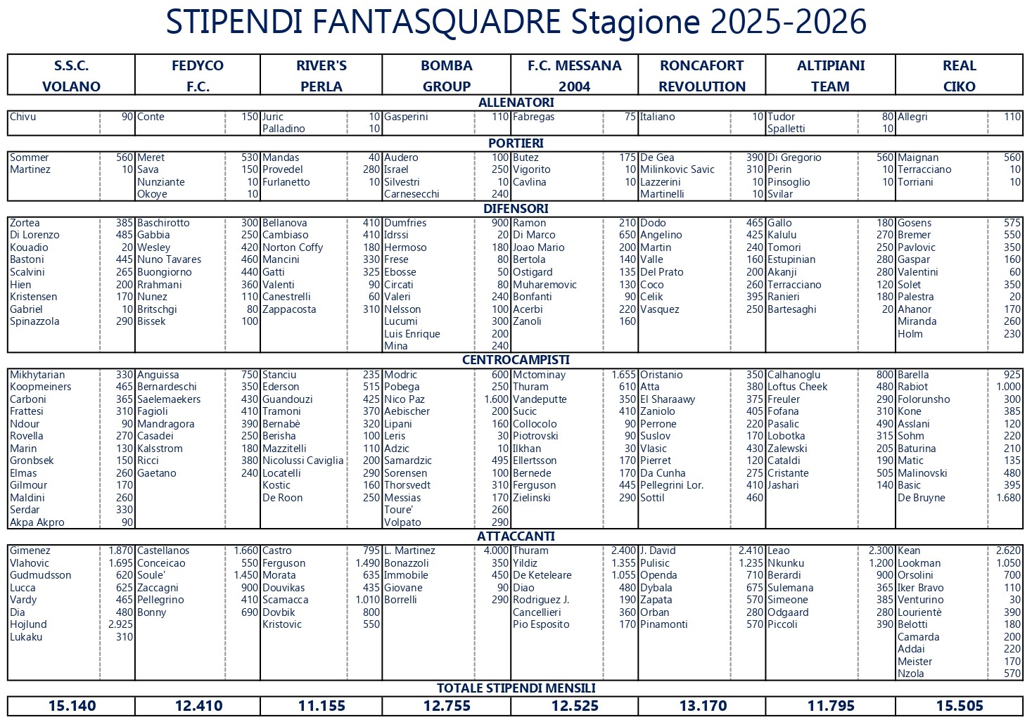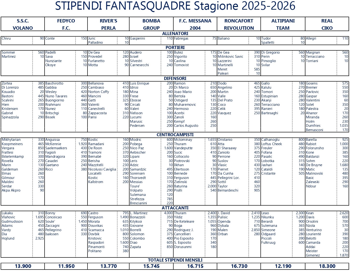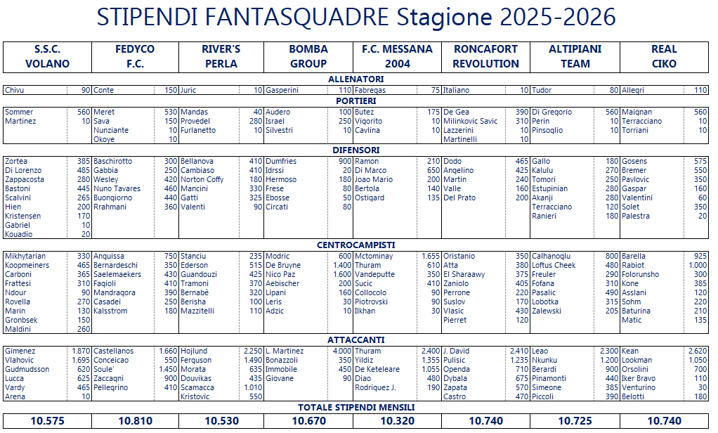 Stipendi Giocatori Stagione 2025/2026